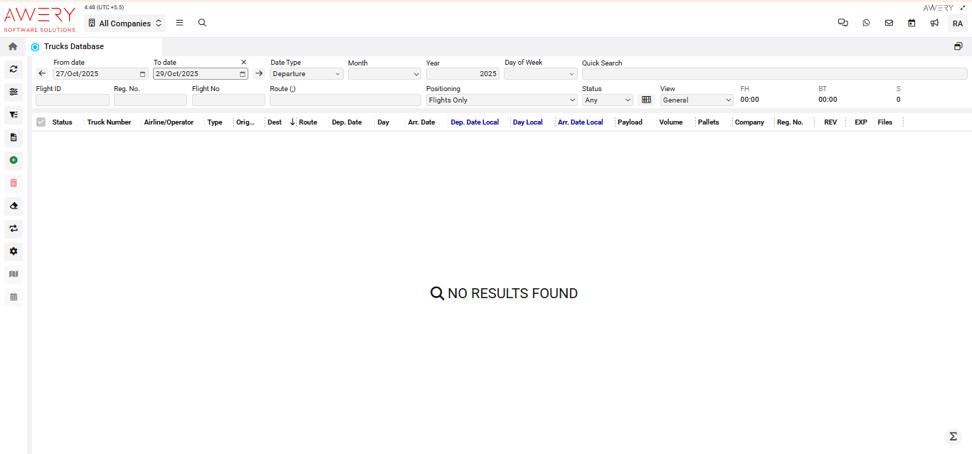 The Trucks Database lists all recorded truck operations tied to flight logistics, empowering users to filter, sort, and review important trip data.