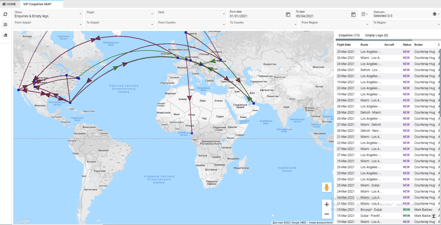 The VIP Enquiries Map allows you to view all enquiries with the VIP type. The interface displays enquiry routes and empty leg paths on a map for the selected period.