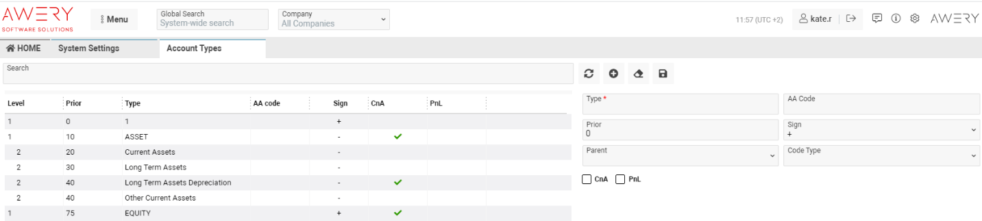 The Account Types module allows users to create and edit account types used when setting up or modifying the Chart of Accounts.