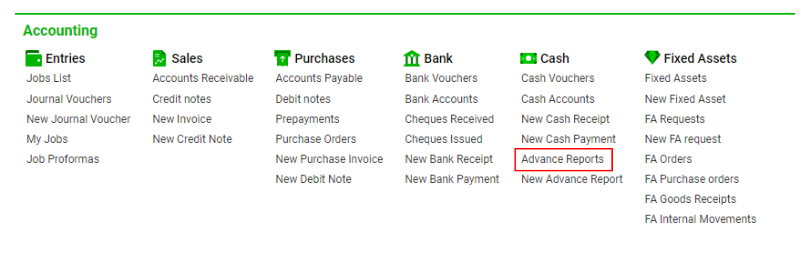 Navigate to the Accounting section and under Cash click the “Advance Reports” button.