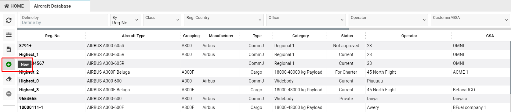 - You have an opportunity to add a new Aircraft to the system by clicking +New button