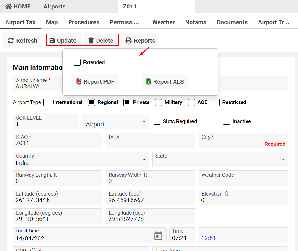 At the top of the tab you can see the main buttons: Add/Update/Delete/Reports (pdf/xls reports for download airport details in simple view or extended view).