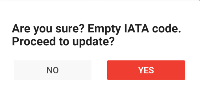 IATA (International Air Transport Association) - you will see the alert when you are trying to save airport data without IATA code: ‘Are you sure? Empty IATA code. Proceed to update?’ and buttons Yes/No