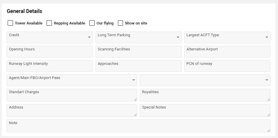 In the General Details block you can mark an airport by a tick if an airport have a Tower, or Repping, or an airport own flying, or you need to show it on a site (setup for portals) you can use Tower Available, Repping Available, Our flying, Show on site ticks.