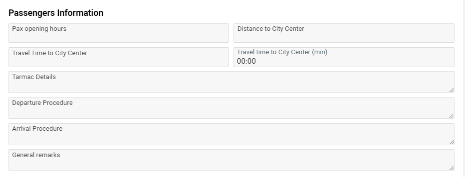 In the Passenger Information block you can clarify Pax opening hours, distance to city center, travel time to city center (input and time input) and different notes: Tarmac Details, Departure Procedure, Arrival Procedure, General Remarks.
