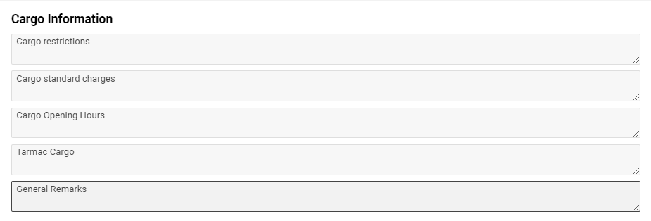 In this block you can check availability of Cargo restrictions, Cargo Standard Charges, Cargo Opening Hours, Tarmac Cargo, General Remarks for an airport.