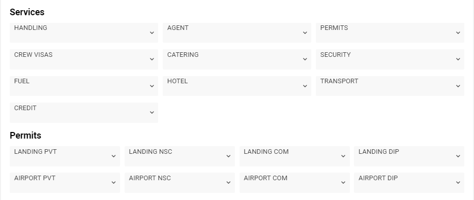 You can mark availability of different services types (handling, agents, permits, crew visas, catering, security, fuel, hotel, transport) and credit condition.