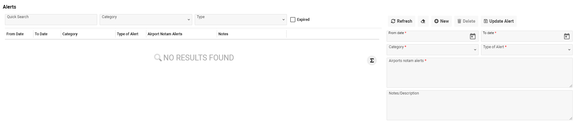You need to fill the From date (mandatory field), To date (mandatory field), Category of an alert (mandatory field), Type of alert (mandatory field), Airports notam alerts (mandatory field), Notes/Description for an alert.