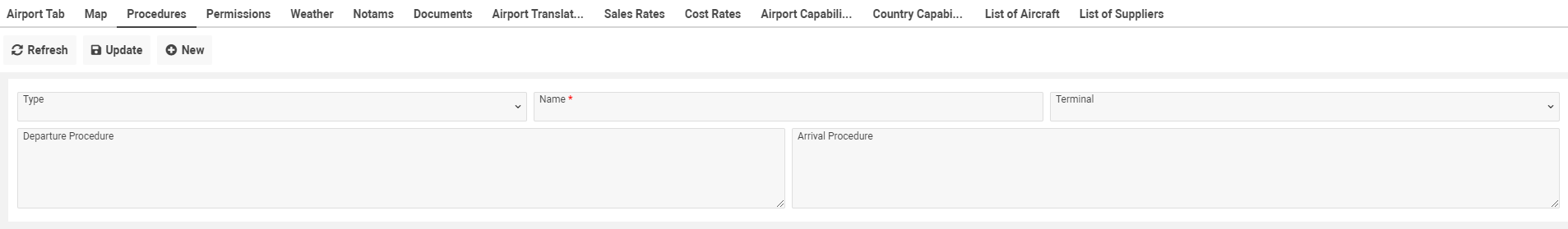 On the Procedures tab you can clarify procedures for the airport and clarify information about it: type of a procedure, name of a procedure (mandatory field), terminal for procedure, notes for departure/arrival procedure.