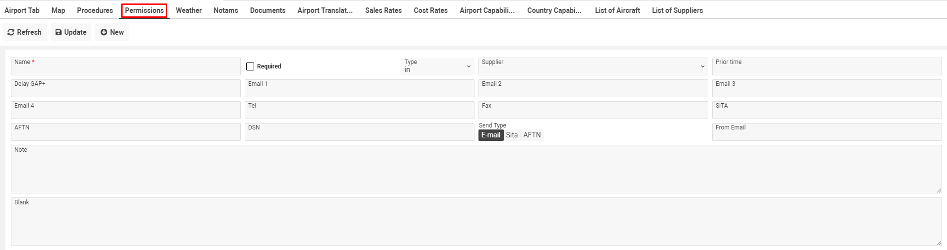 You need to fill Name (mandatory field), tick check-box ‘Required’ in case permission is required, select type of a permission (in/out, by default in), select supplier of a permission, fill in prior time, delay GAP and enter contact data: Email 1, Email 2,Email 3, Email 4, Tel, Fax, Sita, AFTN, DSN, select send type (by default E-mail), From Email.