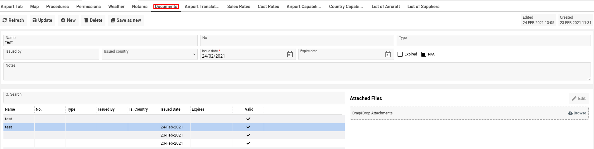 In case you want to add documents for an airport you can use the Documents tab.