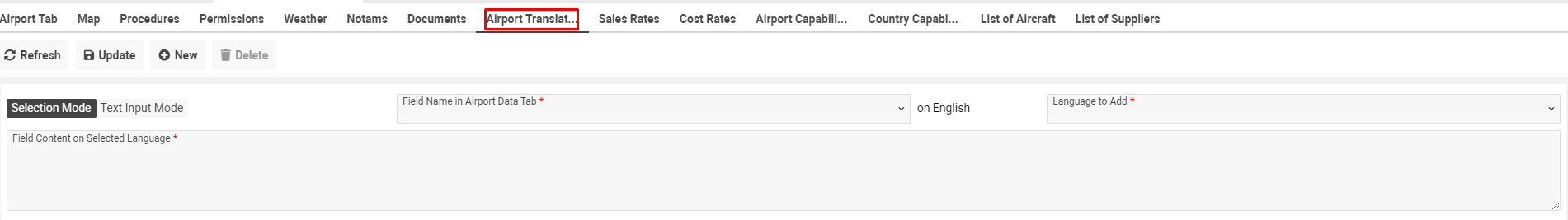 Selection Mode selected by default. You need to select Field Name in the ‘Field Name in Airport Data tab’ selector on english, select language for translate in the ‘Language to Add’ selector and fill in translate to the ‘Field Content on Selected Language’ field.