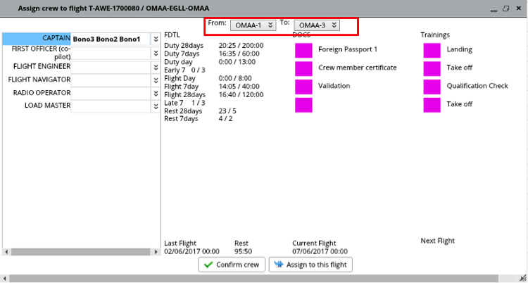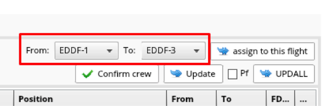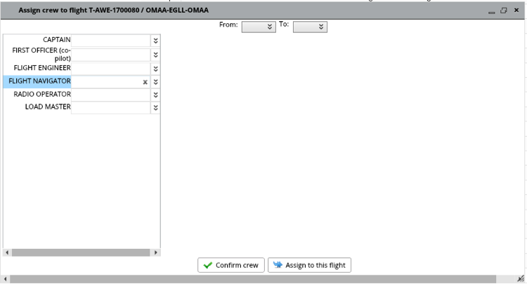 6. After captain is chosen find the waypoint choosing option 'From', 'To'. These are the waypoints (airports) you will assign the captain to. With this option you can assign captain not only for the whole flight, but for for the part of flight too.