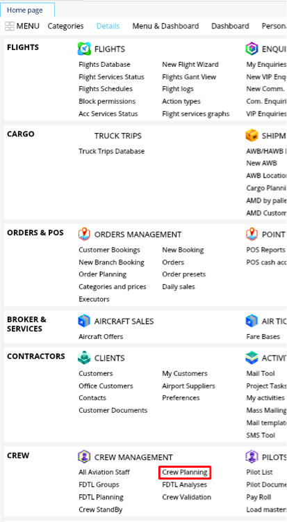 1. Open Crew Planning page (Home Page -> Crew sector -> Crew management -> Crew Planning menu item).