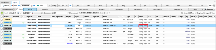 3. Find the flight needed in grid and press 'assign crew' button in 'Crew' column.