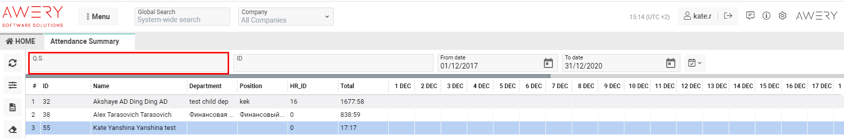 The Quick Search is possible by such columns: #, ID, Name, Position, Department, HR_ID, Days and Total