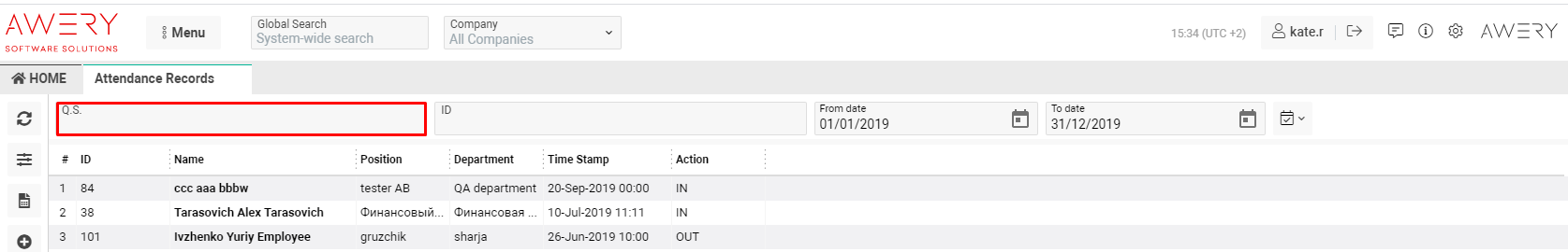 - The Quick Search is possible by such columns: ID, Name, Position, Department, Time Stamp and Action
