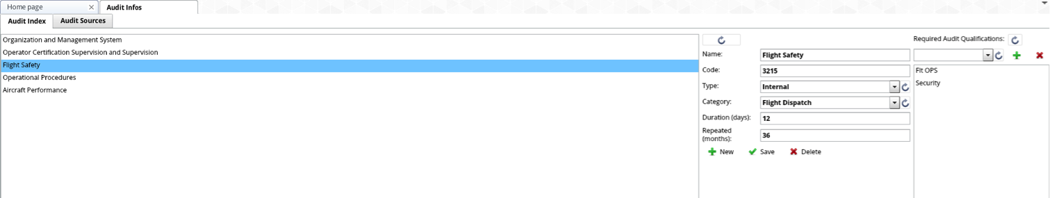 Then insert the data for an audit: Name, Code, Duration, Repeat time and choose Type and Category and Required Audit Qualification