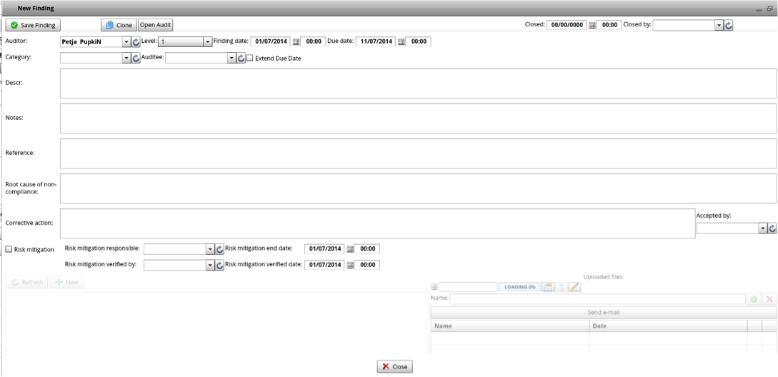 You may attach files to Finding. For this first press Browse file (1), then Upload file (2)