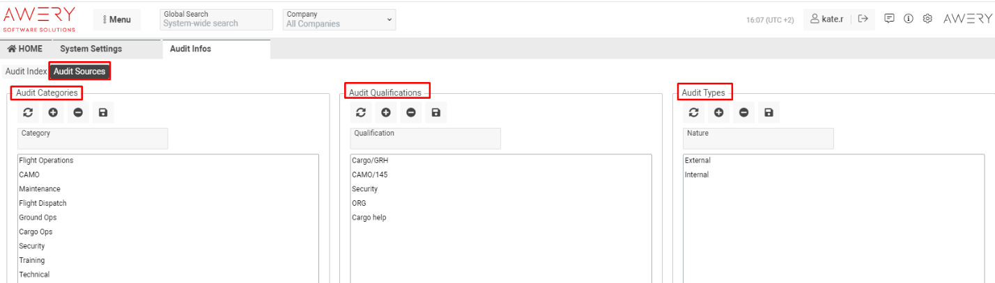 The Audit Infos module allows users to create, edit, and delete audit settings, including different categories, qualifications, and types. These settings can then be used in other audit-related lists.