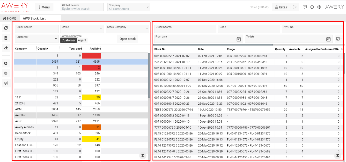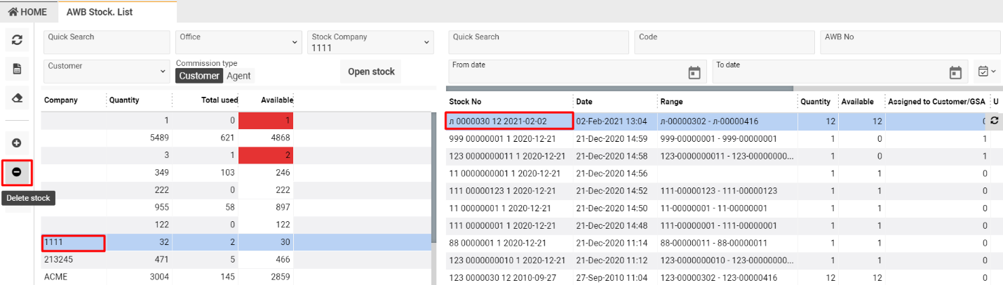 The AWB Stock List interface allows you to manage Air Waybill (AWB) stocks for different stock companies. The interface is divided into two main parts: