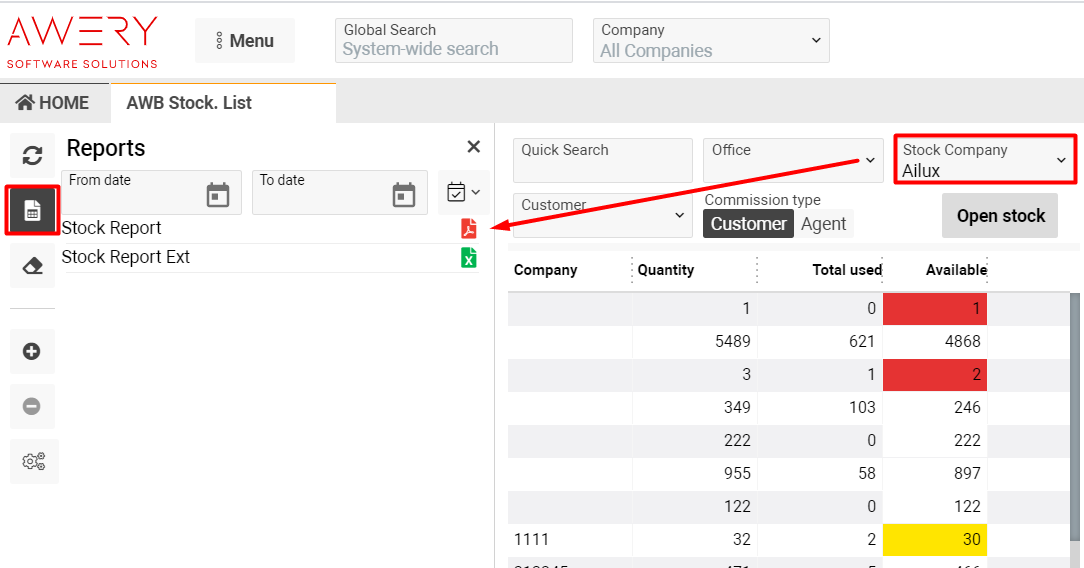 Filter by Office, Stock Company, Agent/Customer: Use these selectors to filter stock companies.