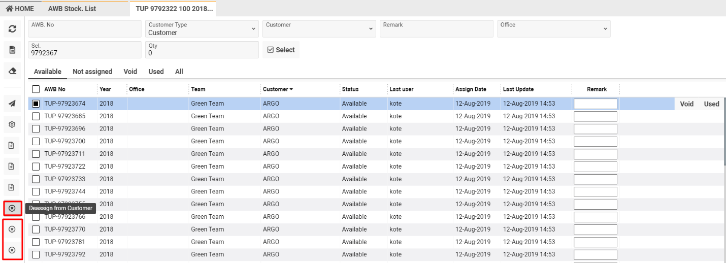 Click the "Used" button to access the AWB creation sidebar, where you can specify details like Company, Customer, Origin, Destination, and more.