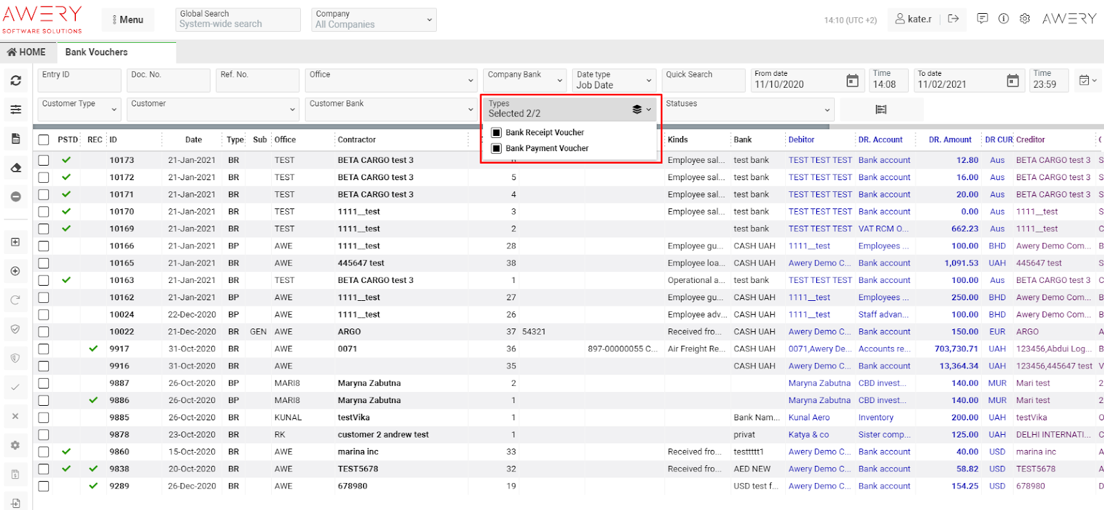 The current page will display entries filtered by Job Type "Bank Payment Voucher" and "Bank Receipt Voucher."