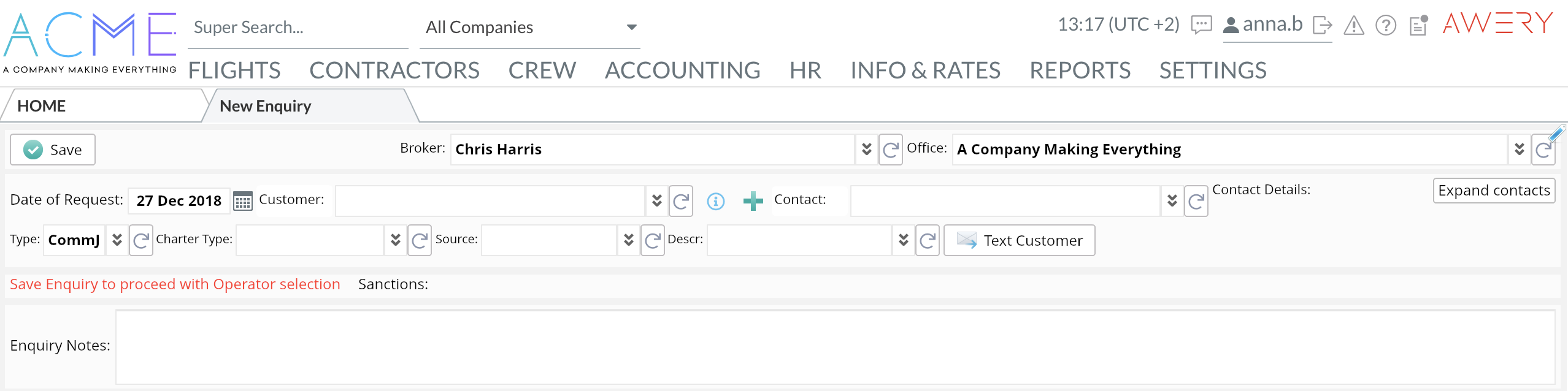 Fields Charter Type, Source, Description, Enquiry Notes are optional for completion.