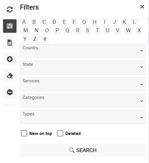 Selectors: Status, Office, Types, By Company/Category, Country, State, Services, Categories, Types.