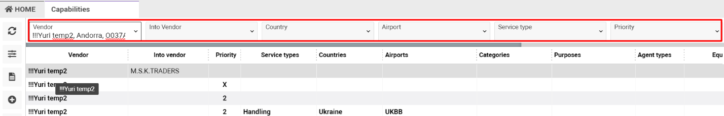 Select entries: Use the Vendor, Into Vendor, Country, Airport, Service Type, or Priority selectors to locate specific capabilities.
