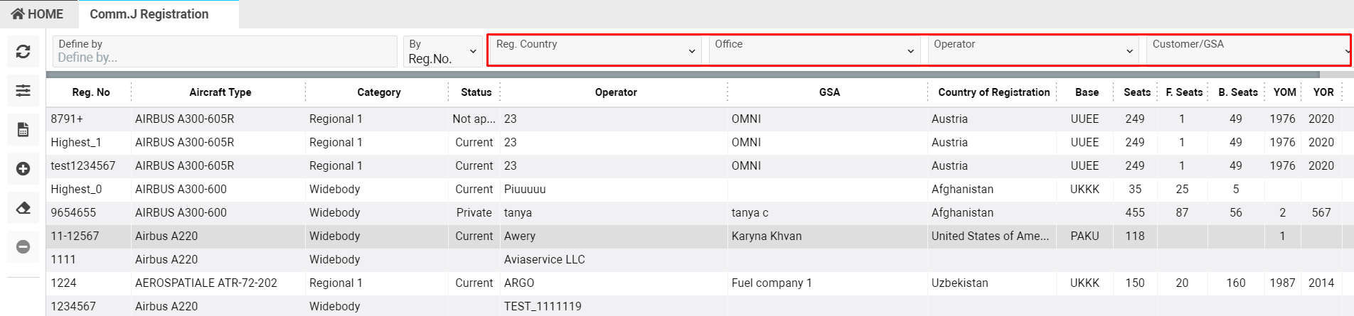 Home→Flights module→Aircraft section→Comm. J Registration
