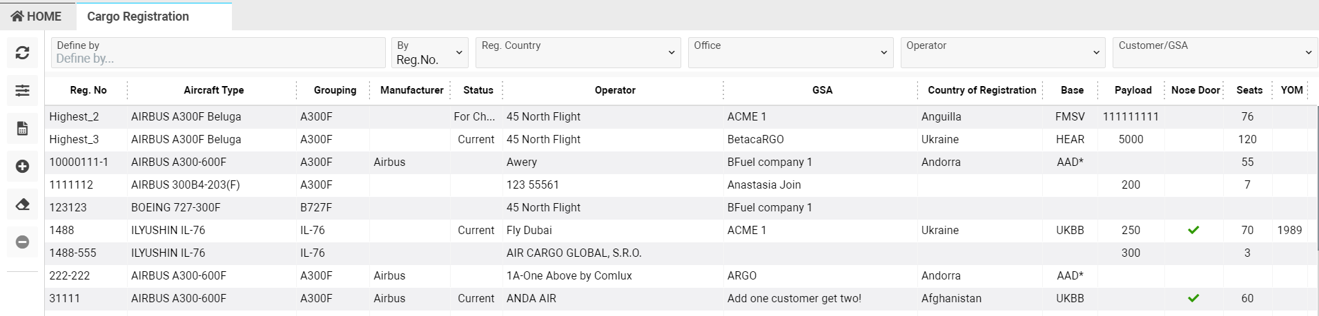 - Nose Door - aircraft with nose door is marked by a tick