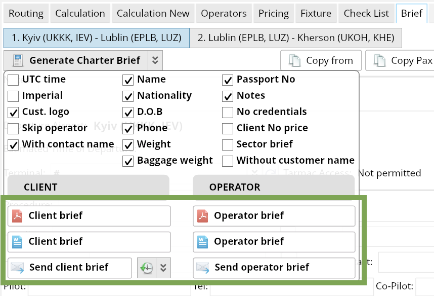 Click "Generate Charter Brief" to create Brief in PDF, Word or send it to the Client or Operator: