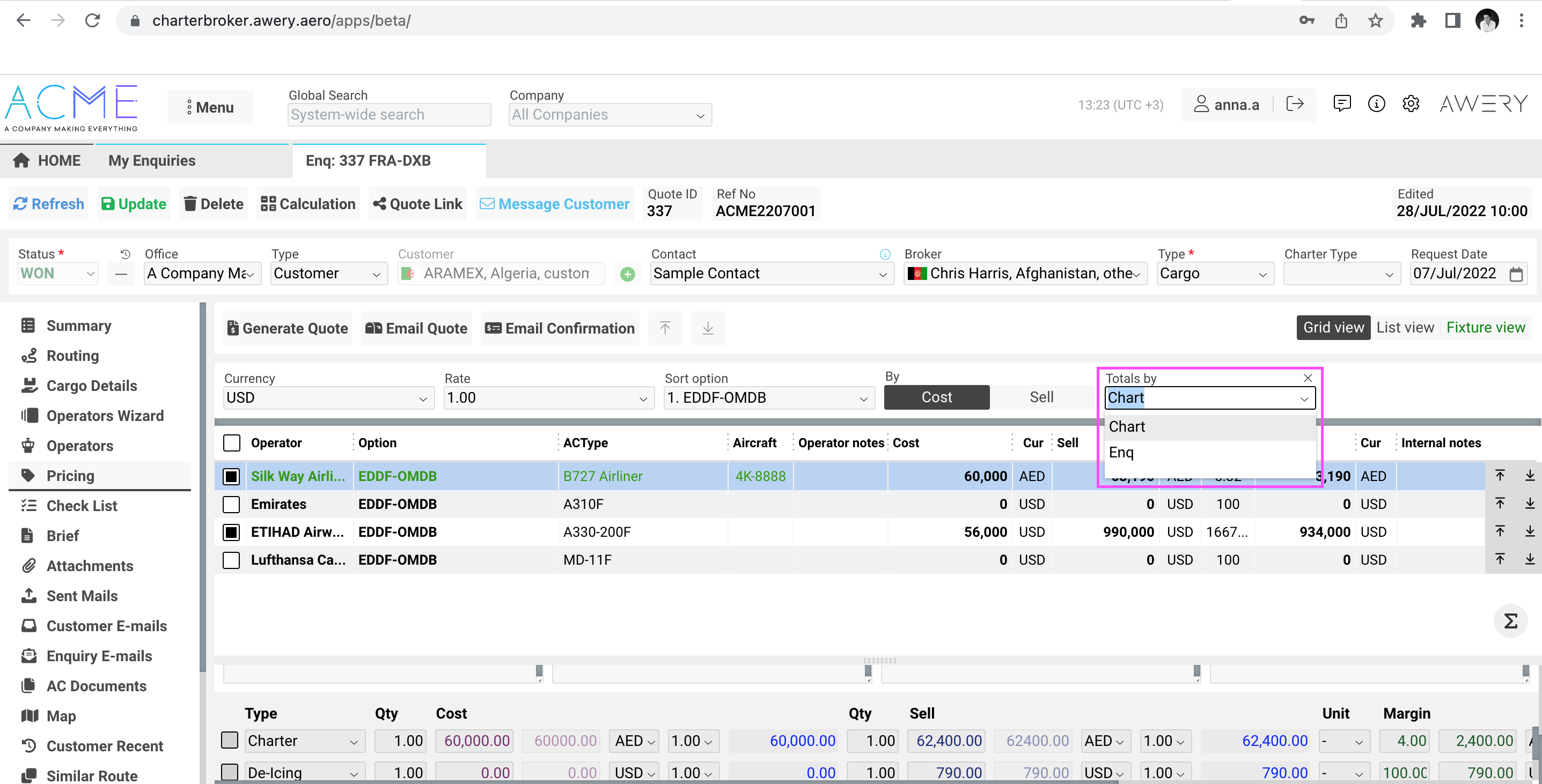 Enquiry page → Pricing tab → Selector "Totals By"