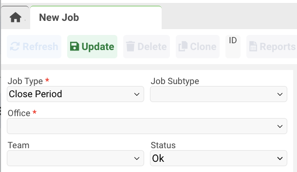 Select Job Type: Close Period and enter Details: