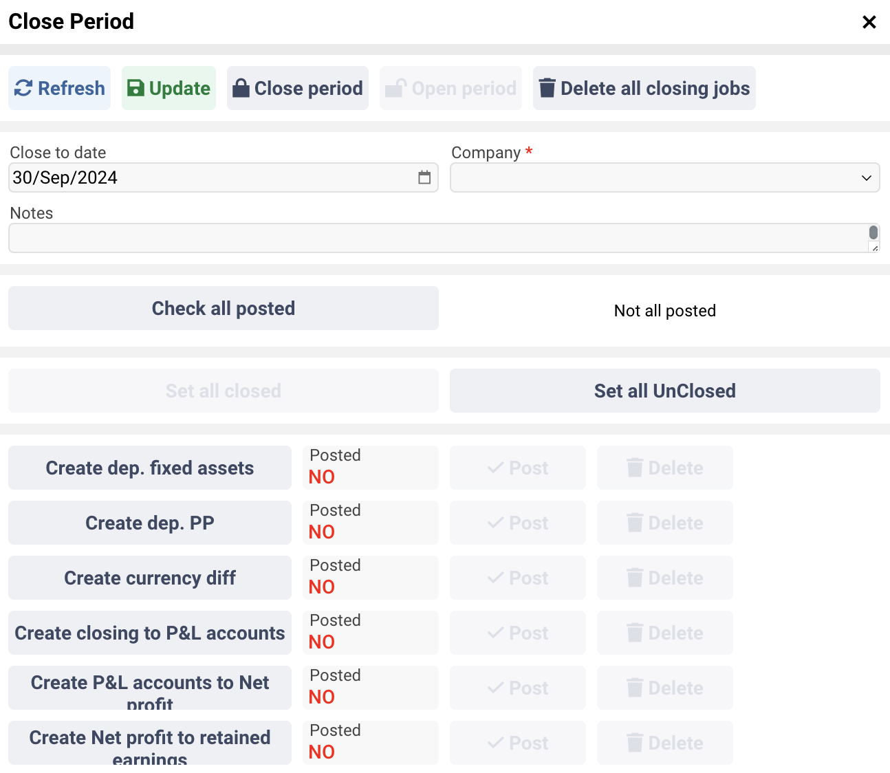 a. Check all Jobs for the period are posted to proceed. If unposted jobs are remaining, “Not all posted” will be displayed for rectification.