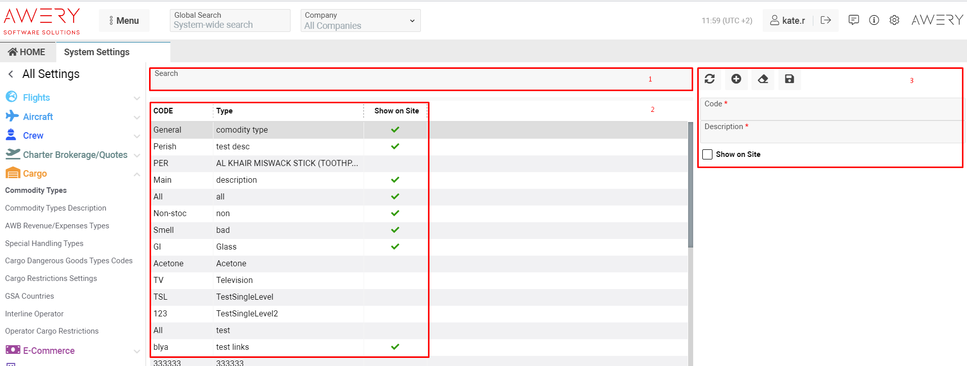 The AWERY System allows you to customize the list of commodity types according to the company needs