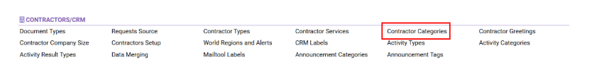 Navigate to the Settings section and under the System Setup Section click the “System Settings” Button. Then under the Contractors/CRM Section click the “Contractor Categories" button.