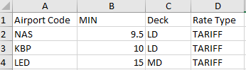 Airport | Min Charge | Deck | Rate Type | 5 | 6 | 7 |