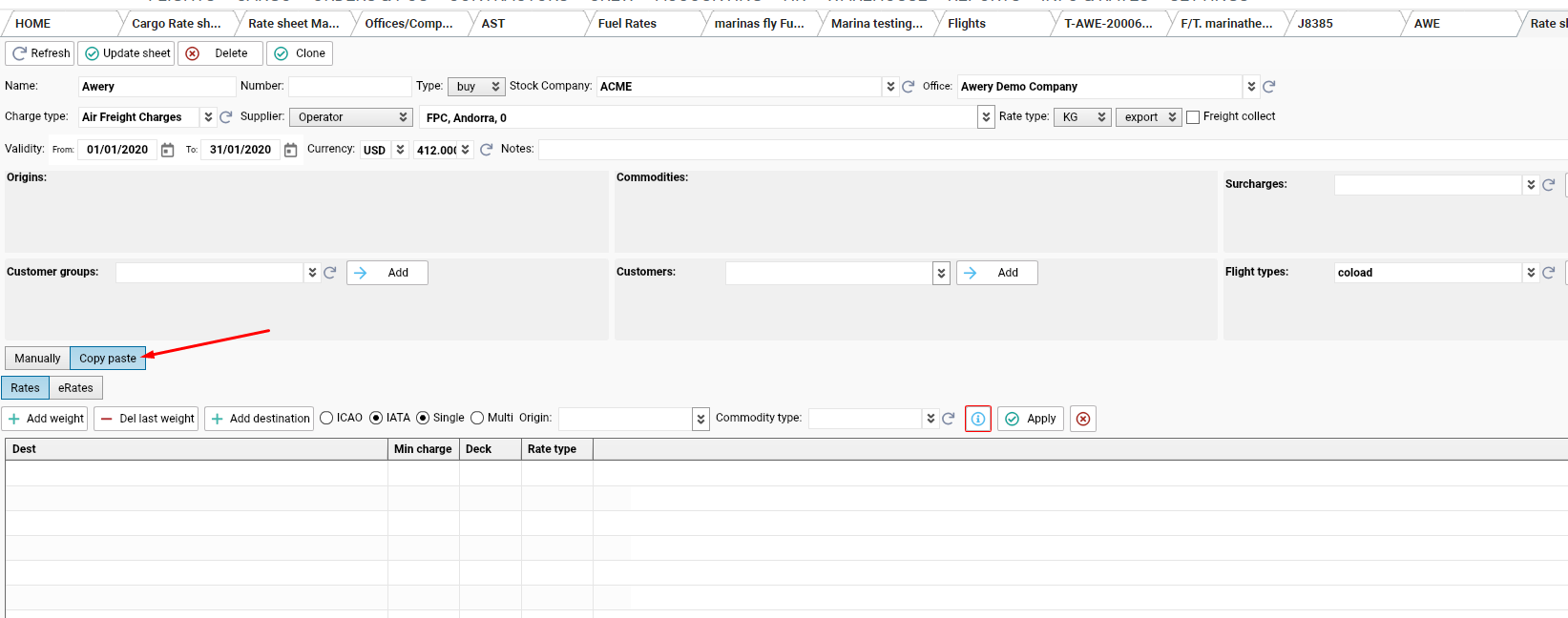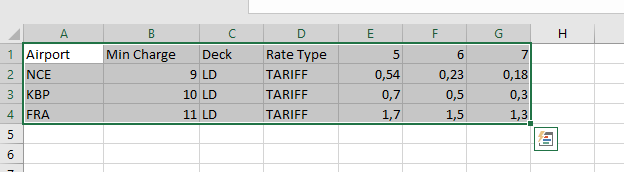 Copy-paste feature allows you to copy destination, minimum charge, deck position, and rate type information and easily paste it to rate sheet, to make it correctly please follow next requirements: