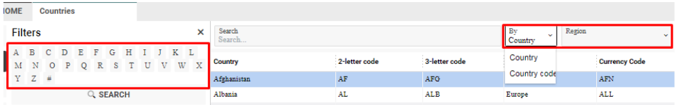 There you can find information about the unique code of the country, official currency, its region and sanctions.