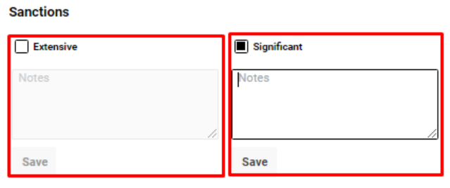 Extensive, Significant, Arms Embargo, Financial Restrictions/Sanctions, List-Based and Transit Cargo Prohibited checkboxes and their fields with notes