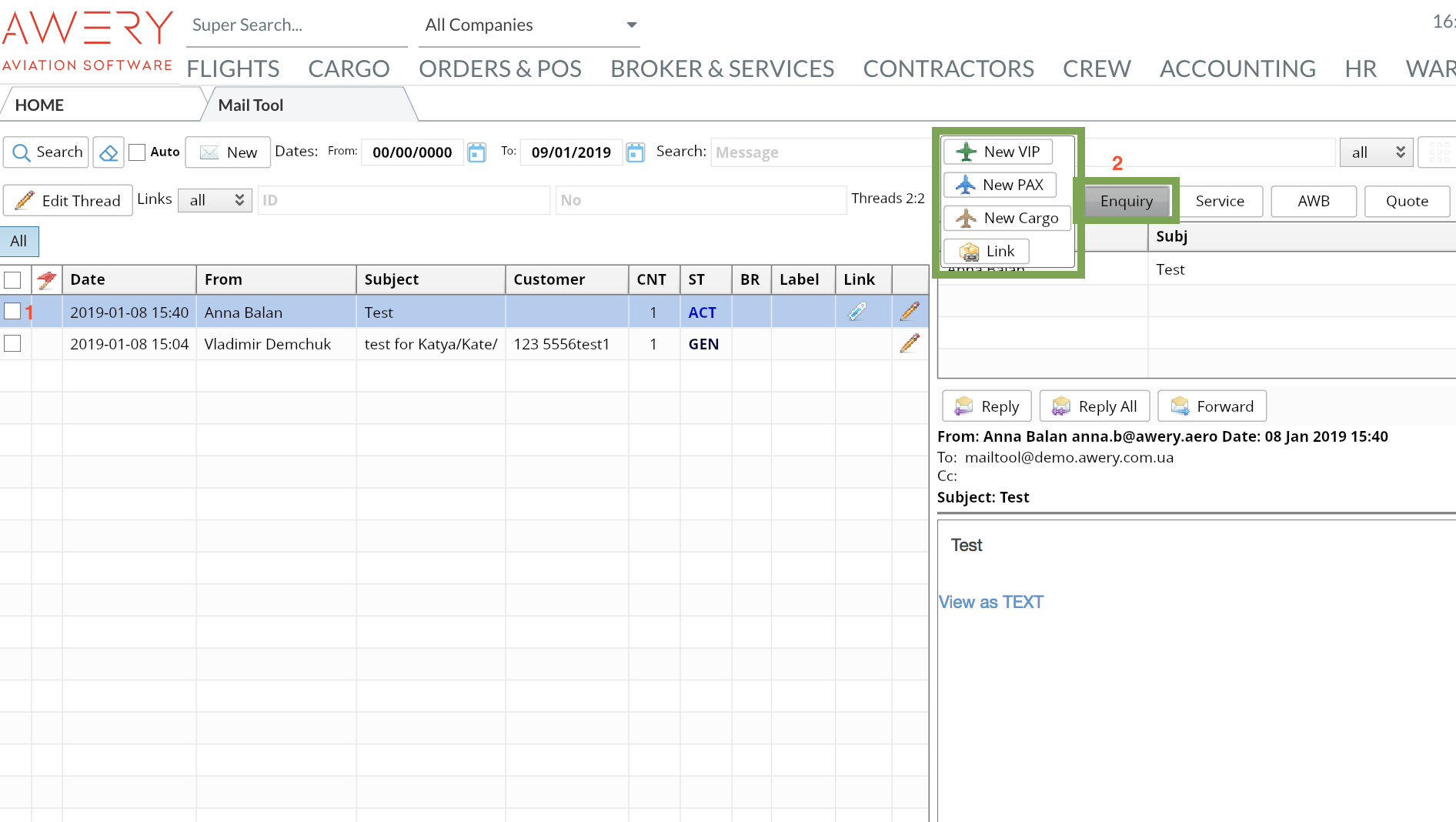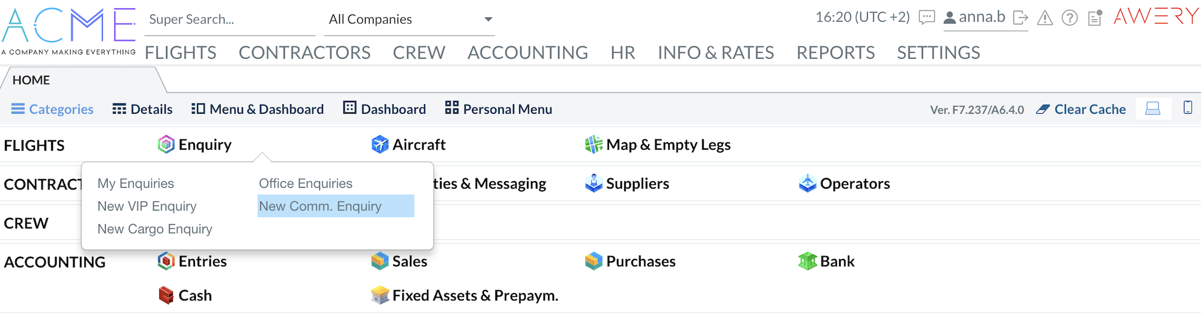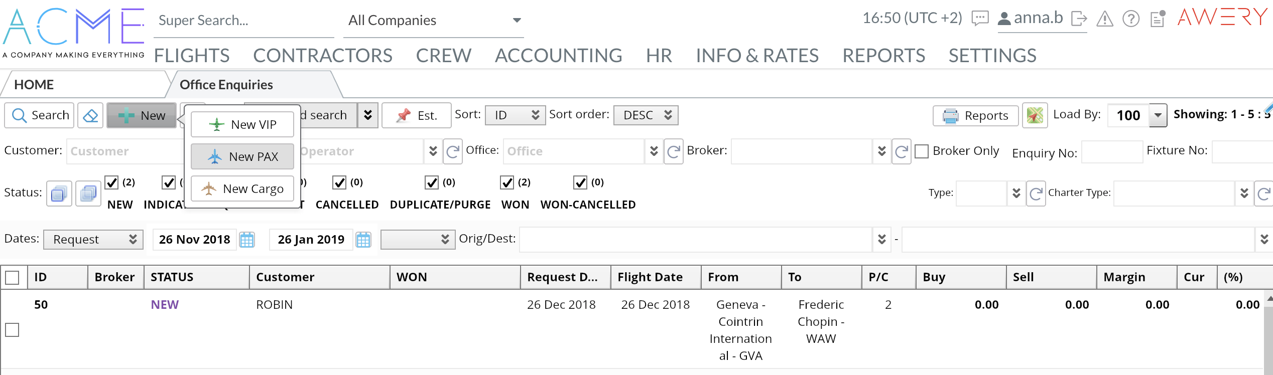 2. Open Homepage→ Enquiry→ Office Enquiries→ New→ New (VIP, PAX, Cargo)