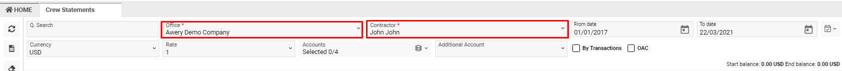 - Office, Contractor, Currency, Rate, Accounts Additional Account, Special Documents selectors. Pay attention that the Office and Contractor fields are required.