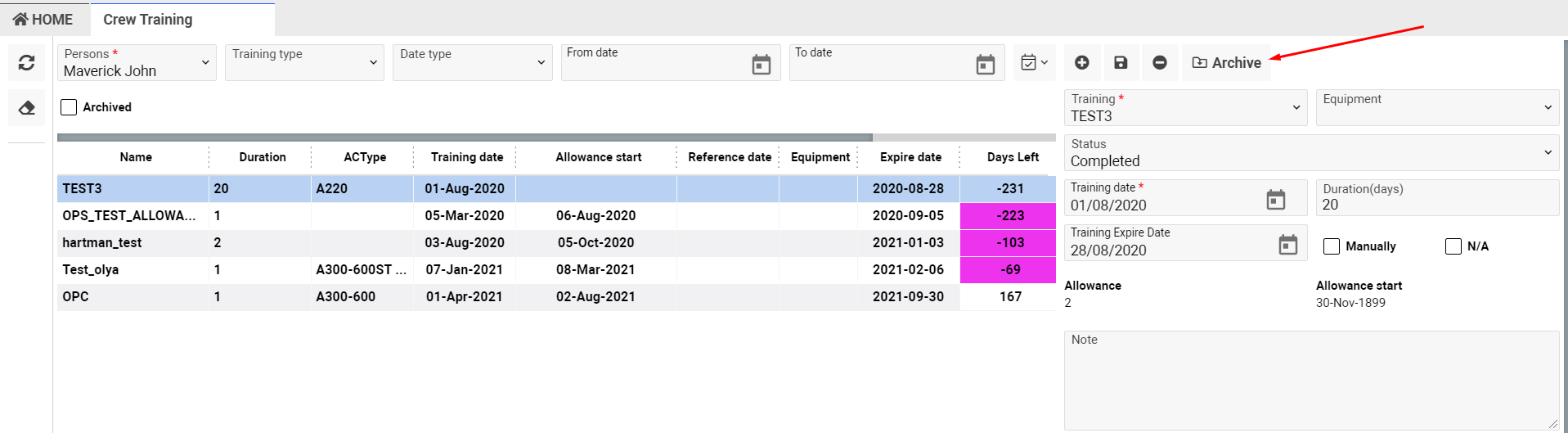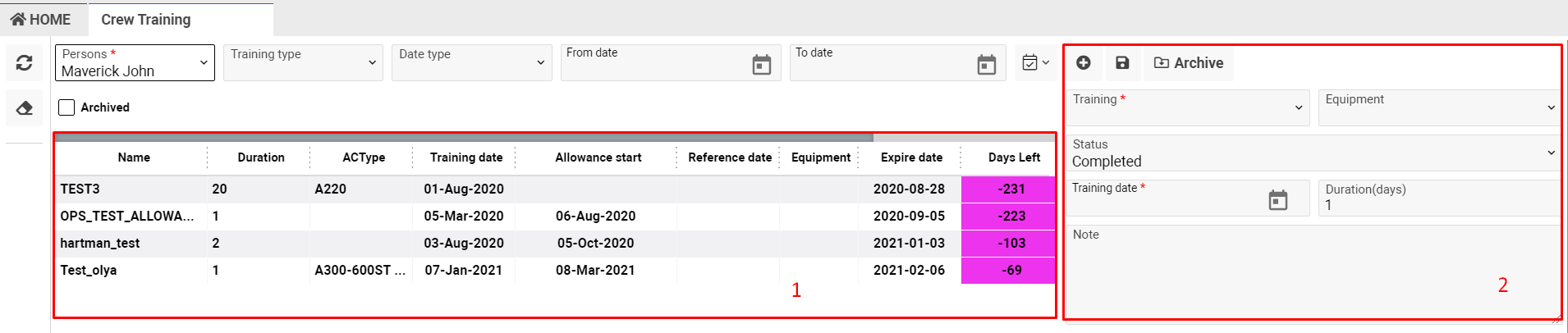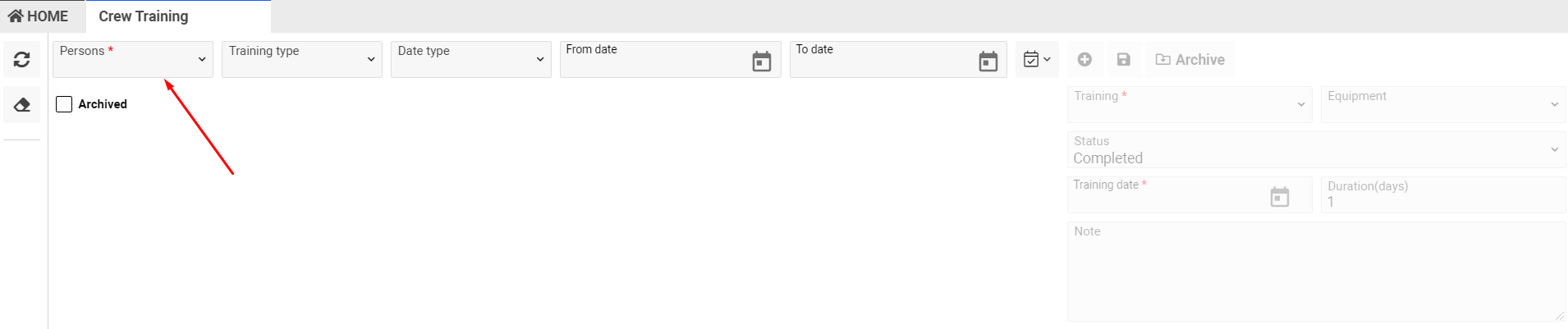 1 | Training | Selection of the training type. Training dropdown contains training type according to the Position of the selected Person (Pilot, Attendance or Maintenance). |