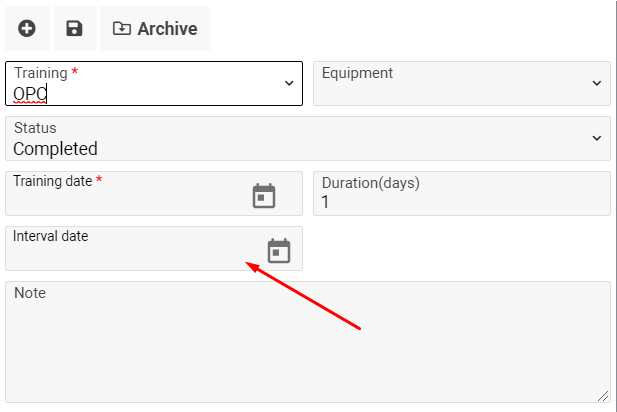 If Interval period is entered for the selected Training Type, then Interval date field also will be available to be filled in.