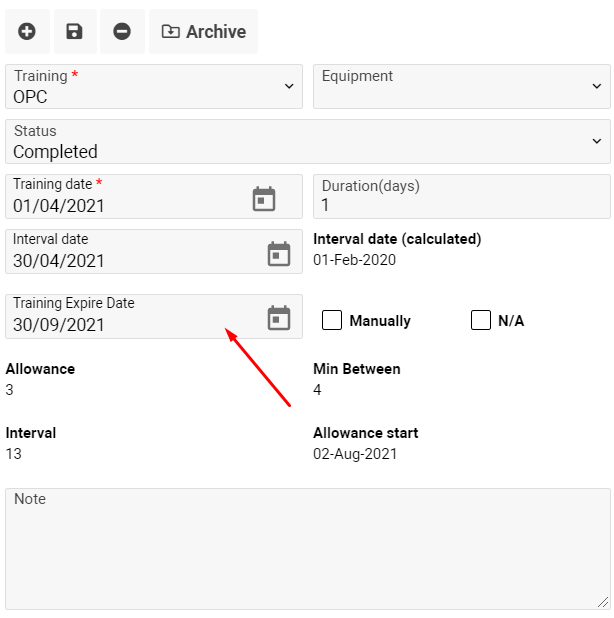 9 | Tick «Manually» | If “Manually” is ticked, then Training expire date can be entered manually and the system will not calculate the Training expire date automatically. |