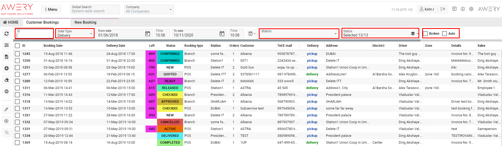 Using the “Delivery type” filtration, you can sort bookings by the way of delivery goods (pick up or delivery)