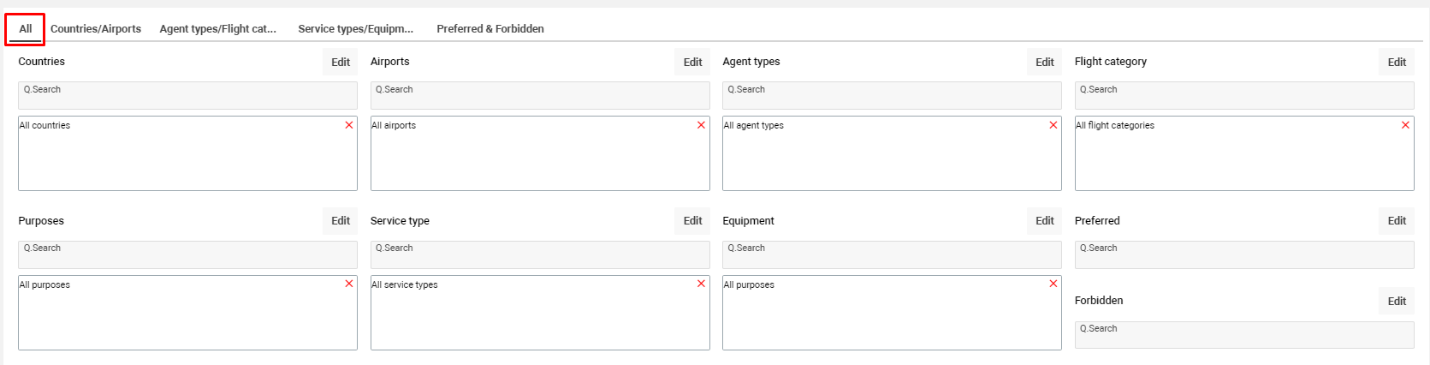 Agent Types/Flight Categories/Purposes Tab: All options are selected by default. You can deselect if needed.